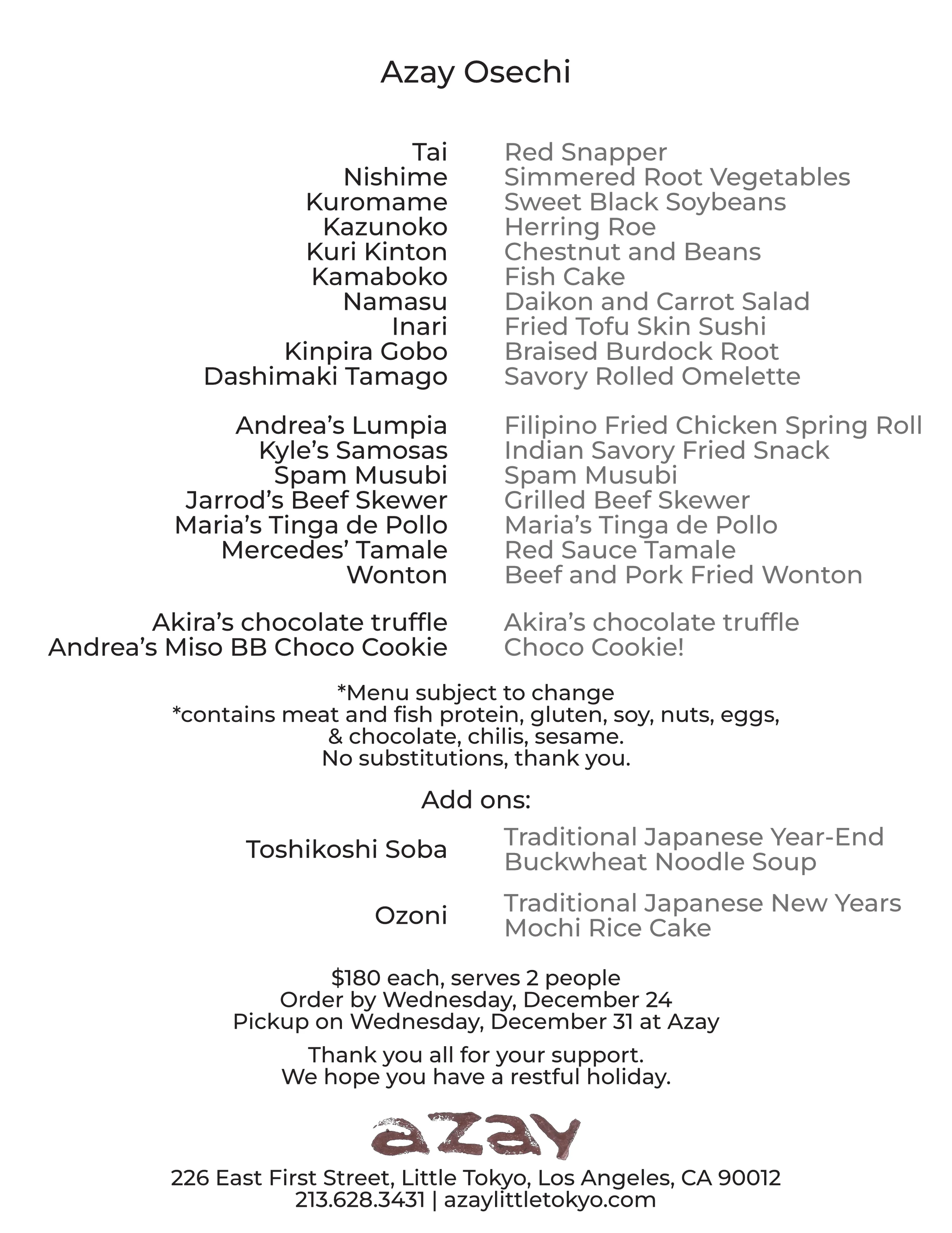 This year, we are also preparing Ozoni, traditional Japanese new years mochi rice cake soup, and Toshikoshi Soba, new year’s eve buckwheat noodle soup as add-ons. Ozoni symbolizes good fortune, prosperity, and longevity, and Toshikoshi Soba symbolizes letting go/(noodles) breaking away from the past year’s hardships and welcoming the new year with wishes for longevity, resilience and good fortune, thanks to the noodles’ long strands.